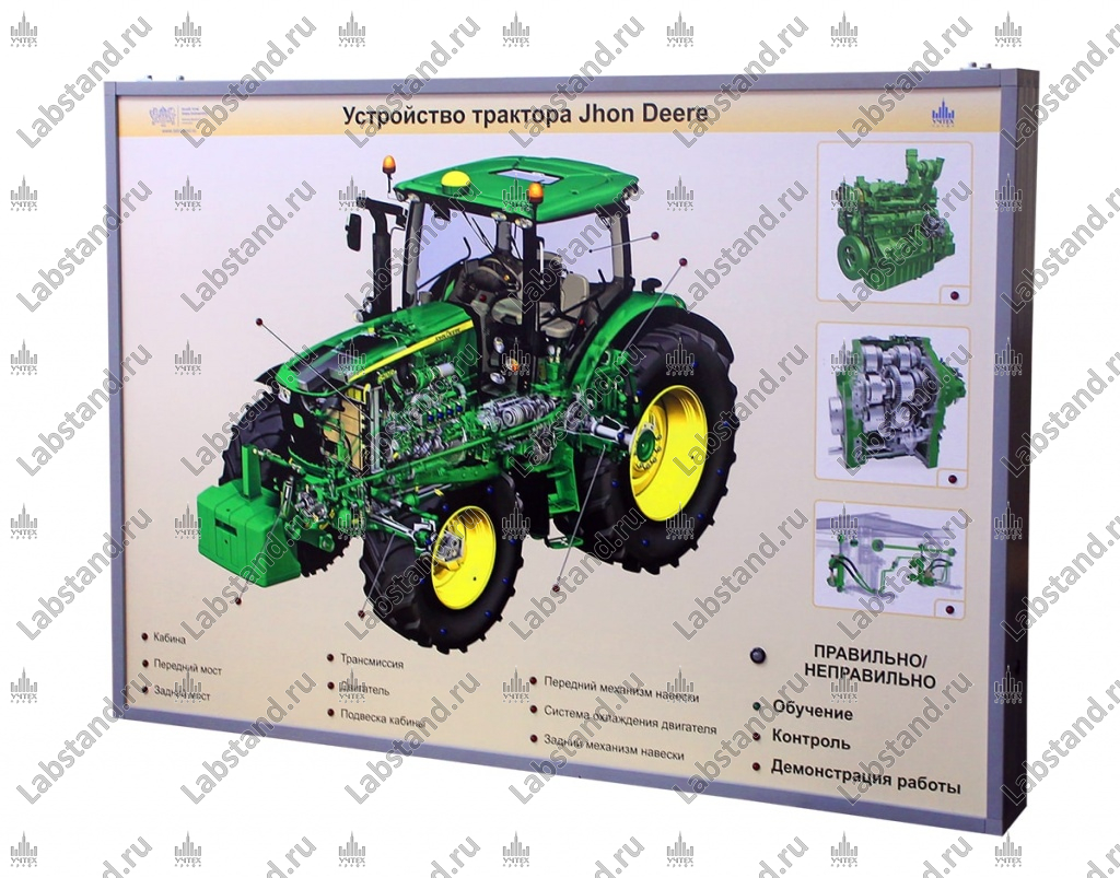 Описание. Стенд-планшет светодинамический представляет собой лицевую панель из МДФ толщиной не менее 8 мм в каркасе из ПВХ профиля шириной не более 90мм с подвесами и задней стенкой из МДФ. На лицевой панели наклеена подложка с полноцветным графическим изображением устройства трактора Jhon Deere. Внутри каркаса расположен контроллер управления логикой стенда. С целью наглядной иллюстрации принципа работы механизма на лицевой панели установлены динамическая светодиодная подсветка и магнитные сенсоры для реализации режимов «обучения» и «контроля». В режиме «обучения» при выделении одного из элементов трактора Jhon Deere загорается светодиод напротив соответствующего наименования элемента. В режиме «контроля» учащийся должен сам сопоставить наименование элемента с его изображением на подложке.