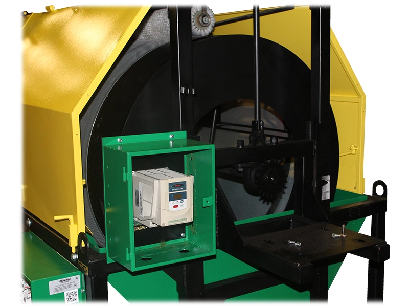 Стенд-тренажер с агрегатами в разрезе и электромеханическим приводом "Семяочистительная машина" представляет собой семяочистительную машину, с выполненными разрезами корпусных элементов основных узлов. Демонстрацию принципа работы и регулирование частоты вращения подвижных элементов машины обеспечивает частотный преобразователь. Разрезы выполнены на корпусе воздушно-очистительной части, загрузочного транспортера, решетного стана.