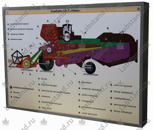 Назначение: Стенд-планшет предназначен для изучения принципа действия приборов и составных элементов комбайна СК-5 Нива в учебном курсе «Уборочные машины».