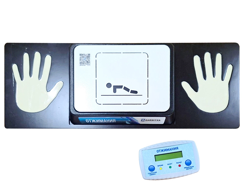 Спортивный комплект "Отжимание от пола" представляет собой контактную платформу, располагаемую на полу под грудью отжимающегося, и предназначен для автоматической регистрации факта касания грудью платформы при выполнении упражнения. Платформа снабжена беспроводным пультом управления, с помощью которого тренер может контролировать результативность и учитывать правильность выполнения упражнения. Опционно, вместо пульта управления, можно использовать планшет или ноутбук.