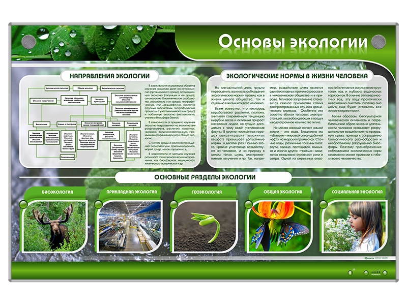 Электрифицированный стенд представляет собой полноцветную светодинамическую панель, на которой отображена информация об основных экологических нормах, разделах и направлениях экологии.