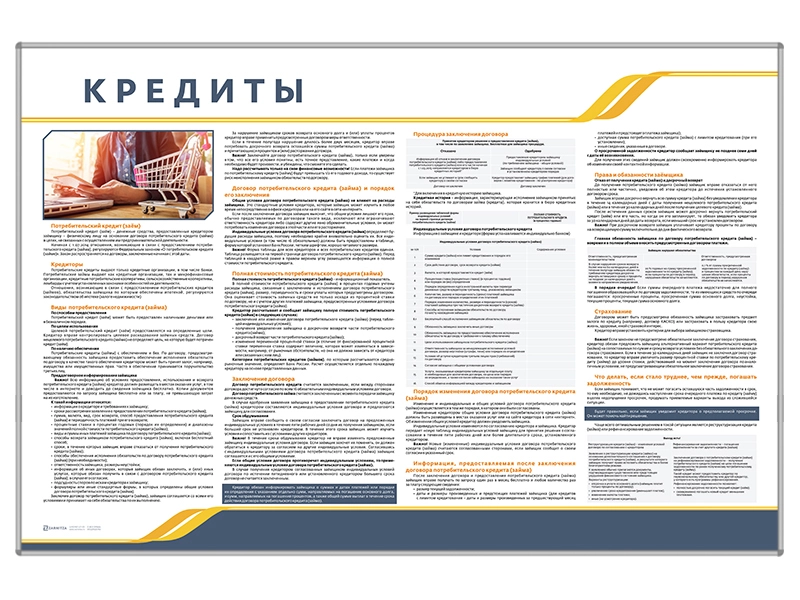 Стенд представляет собой полноцветную панель с информацией о видах потребительских кредитов, способах их получения и погашения.