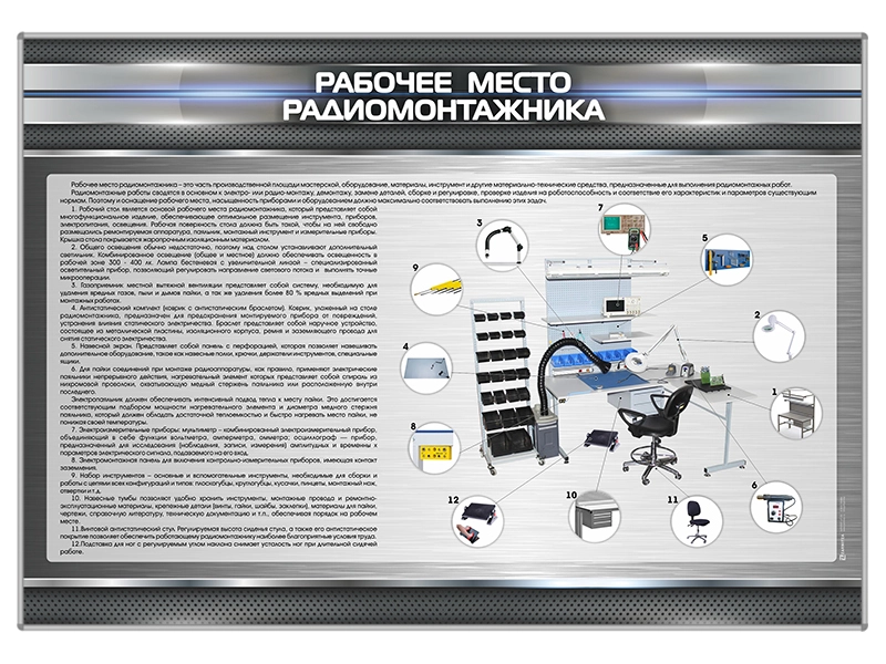 Стенд представляет собой панель, на которой изображено рабочее место радиомонтажника.
