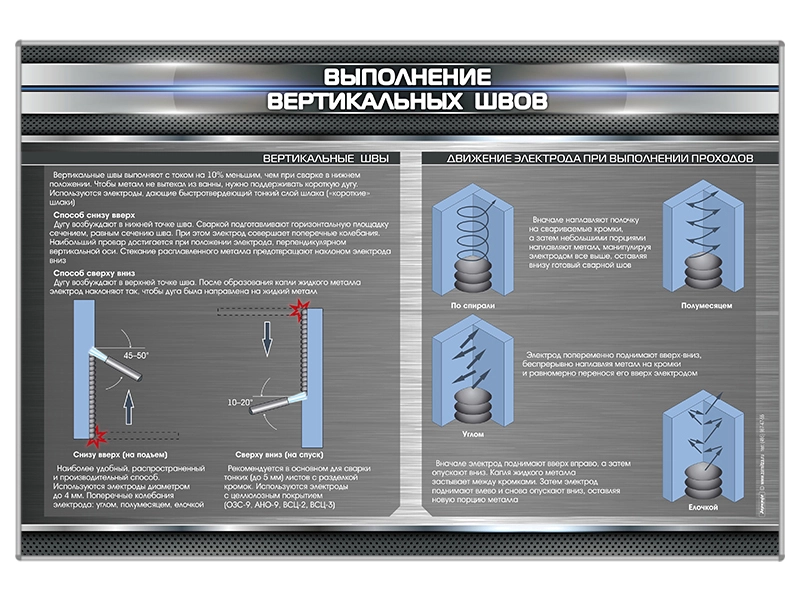 Стенд представляет собой панель, на которой изображена техника выполнения вертикальных сварных швов.