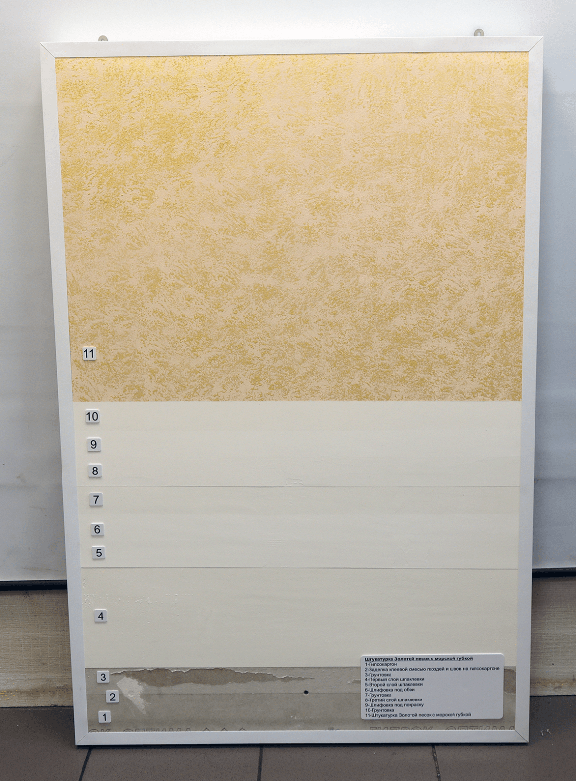 - Образец штукатурки нанесен на деревянную табличку, закрепленную на композитной панели.
