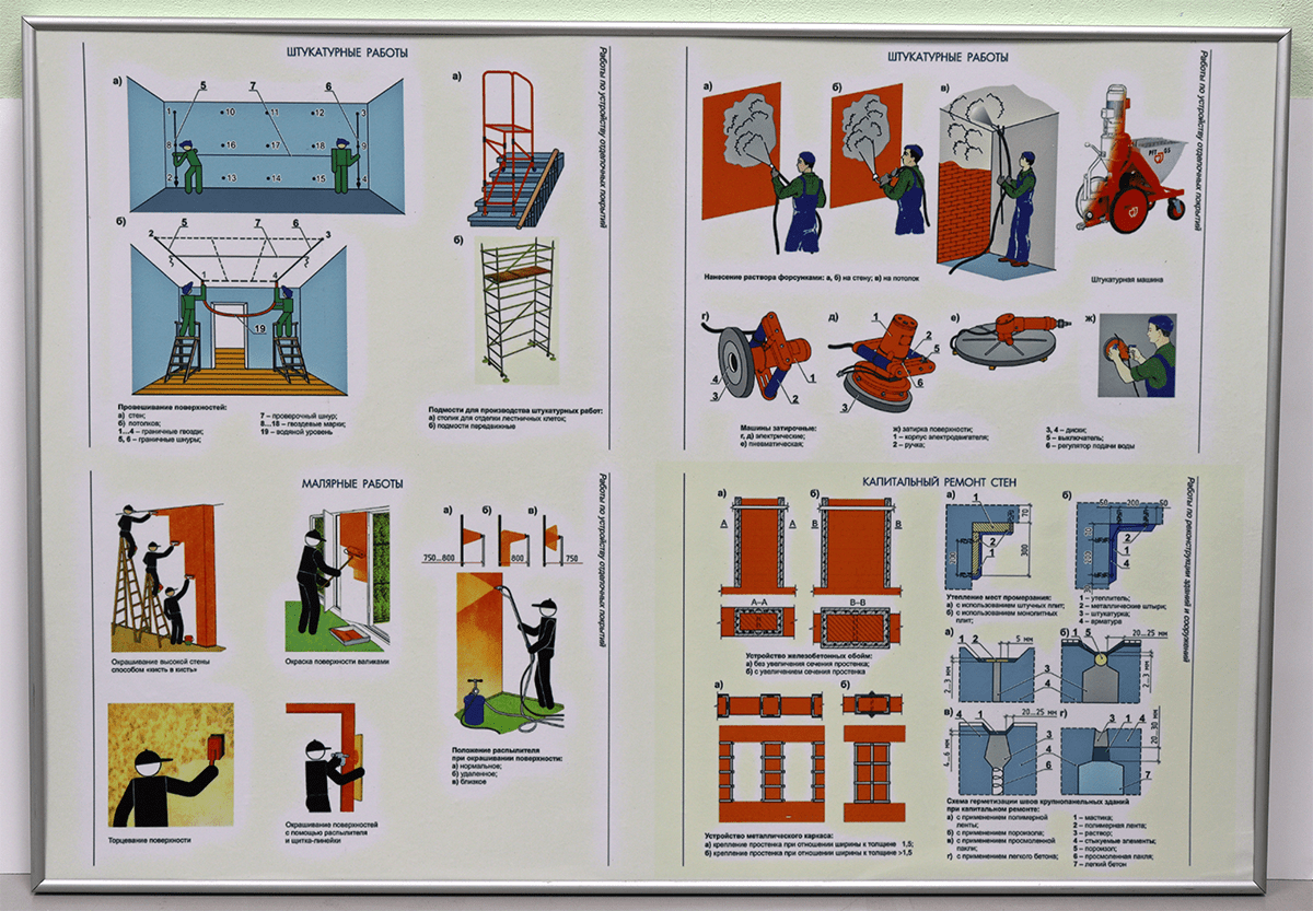- Макеты стен с отделкой штукатурки – кирпичные стены, стеновые перегородки из ГКЛ. Макеты позволяют поэтапно изучить процесс подготовки стен, нанесение штукатурных смесей различными способами, финишную отделку стен.