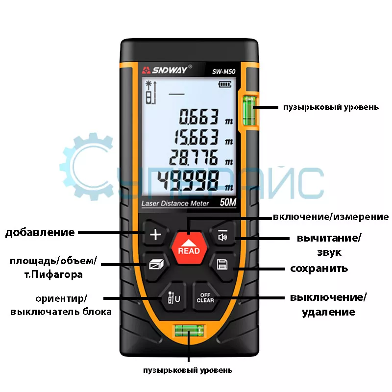 Обновлённую версию бесконтактного измерительного прибора представляет китайский бренд SNDWAY: лазерный дальномер SW-M50 — это вариант высокоточного инструмента, который поддерживает функцию расчёта площади и может измерять расстояние в пределах пятидесяти метров.
