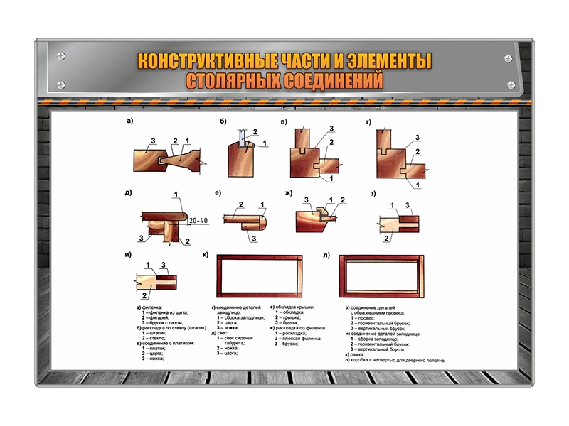 Стенд представляет собой информационную панель, на которой изображены конструктивные части и элементы столярных соединений.