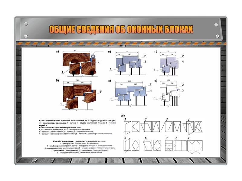 Стенд представляет собой информационную панель, на которой размещены общие сведения об оконных блоках.