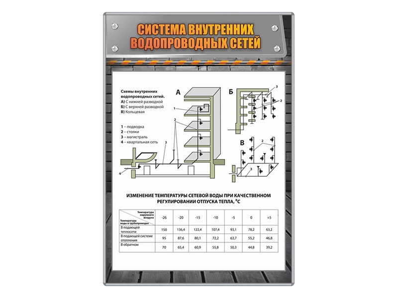 Стенд представляет собой информационную панель, на которой размещены общие сведения о системе внутренних водопроводных сетей.