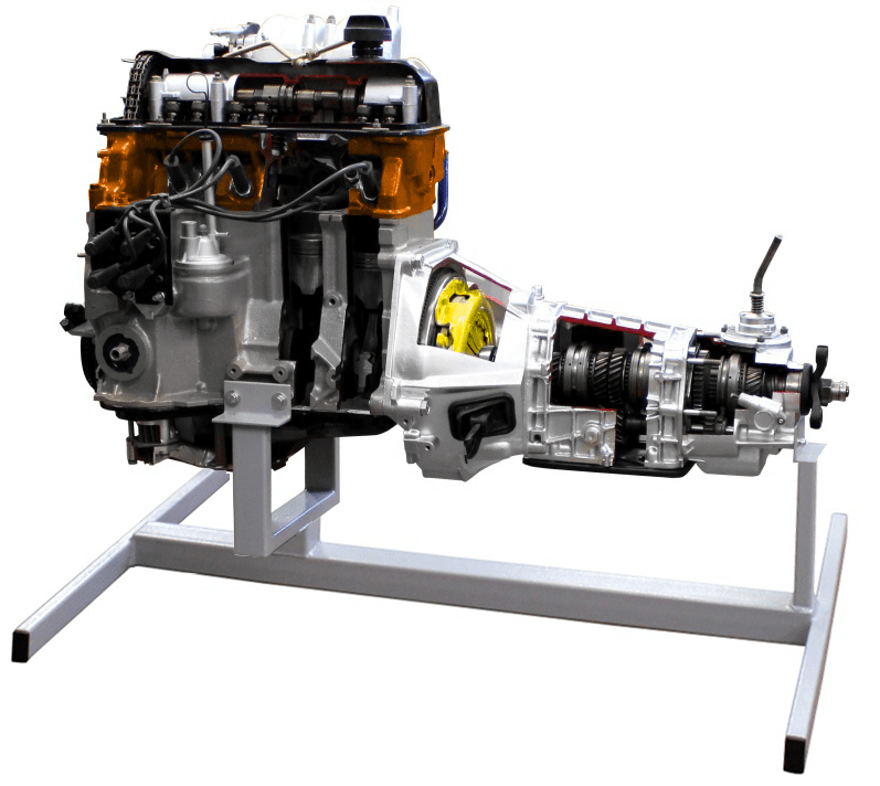 Стенд выполнен в виде разрезной напольной конструкции двигателя, закрепленным на раме и обеспечивает изучение группой учащихся назначение, состав, особенности конструкции и принцип работы силового агрегата легкового автомобиля с передним приводом ведущих колес, на примере двигателя ВАЗ.