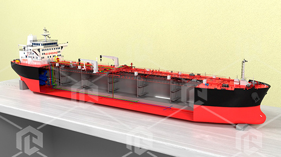 Макет нефтяного танкера класса Aframax (аналогичный танкеру Залив Америка или другой) с прозрачным исполнением корпуса в районе нефтяных танков для изучения конструкции и общего устройства специальных систем танкера. На данном макете представлено общее расположение трубопроводов и устройств, входящих в перечень специальных систем танкеров.