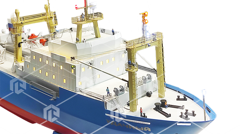 - Макет верхней палубы с размещенными на ней рубкой, мачтами, ходовыми огнями и сигналами.