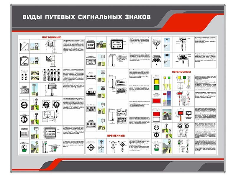 Стенд "Виды путевых сигнальных знаков" представляет собой полноцветную панель, на которой изображены временные, постоянные и переносные сигнальные знаки в цветном, графическом виде и с участком железной дороги, определяющим постановку знаков, а так же текстовые пояснения касательно назначения и мест установки знаков.