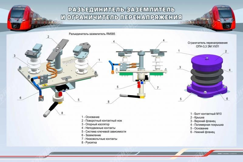 Стенд предназначен для ознакомления обучающихся в железнодорожных учебных заведениях с конструкцией разъединителя-заземлителя и ограничителя перенапряжения и подготовки, переподготовки и повышения квалификации персонала, обслуживающего высокоскоростное движение на ОАО "РЖД".