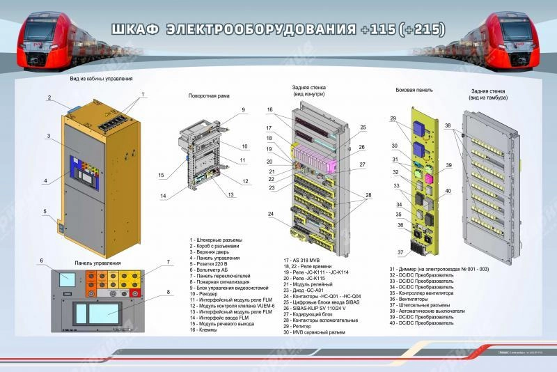 Стенд предназначен для ознакомления обучающихся в железнодорожных учебных заведениях с конструкцией шкафа электрооборудования +115 (+215) и подготовки, переподготовки и повышения квалификации персонала, обслуживающего высокоскоростное движение на ОАО "РЖД".