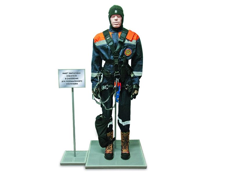 Наглядный макет экипировки спасателя "Промышленный альпинизм и десантная подготовка" представляет собой стоячий манекен, экипированный в снаряжение для промышленного альпинизма (беспарашютного десантирования):