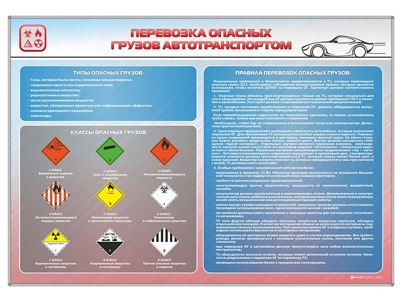 Стенд "Перевозка опасных грузов автотранспортом" представляет собой панель, на которой размещена информация о типах, классах и правилах перевозки опасных грузов.
