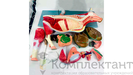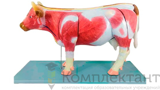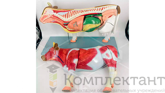 Данный учебный комплекс предназначен для подготовки специалистов ветеринарного профиля и позволяет отработать общие вопросы внешнего и внутреннего анатомического строения КРС, а также строение внутренних органов и их расположение. Данный стенд представляет из себя модель КРС из пластика, установленную на основании в масштабе. Внутренние органы КРС , выполненные из пластика, могут быть закреплены внутри туловища на магнитные держатели. Макет оснащен специализированными метками на каждом из органов, при поднесении специализированного считывателя начинается воспроизведение звукового фрагмента с описанием строения данного органа на русском языке а также открывается трехмерное изображение данной структуры в виртуальном атласе анатомии животного на ПК. Также в комплекте поставляется виртуальный обучающий комплекс с цифровым двойником организма КРС с возможностью изучения анатомии и морфологии организма животного на виртуальной модели.