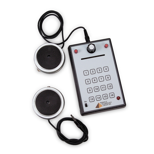 - Тренажер представляет собой компактный блок с кнопками для воспроизведения звуков и двумя подключаемыми динамиками с мягким покрытием