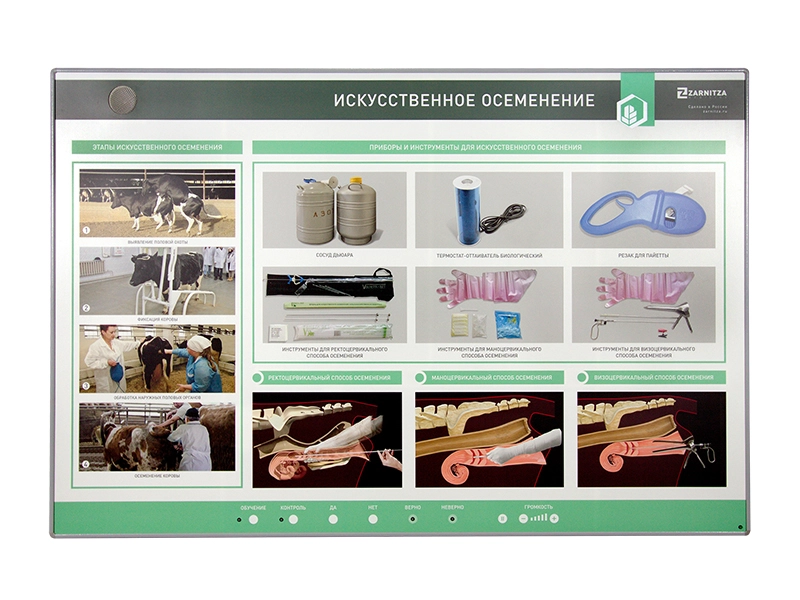 Интерактивный светодинамический стенд представляет собой полноцветную светодинамическую панель, на которой отображена информация о методе оплодотворения самки путем искусственного осеменения. В конструкцию учебного оборудования интегрированы высокочувствительные сенсоры для управления стендом при помощи интерактивного воздействия приемо-передающих устройств. Предусмотрено два режима работы со стендом: "Обучение" и "Контроль".