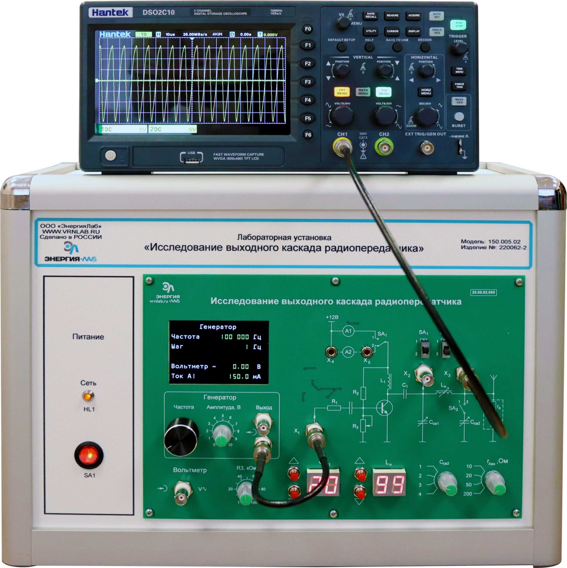 Лабораторная установка формирует одно рабочее место и обеспечивает проведение экспериментов по изучению принципов согласования выходного каскада передатчика с антенной, исследованию регулировочных и нагрузочных характеристик выходного каскада при различных способах подключения антенны.