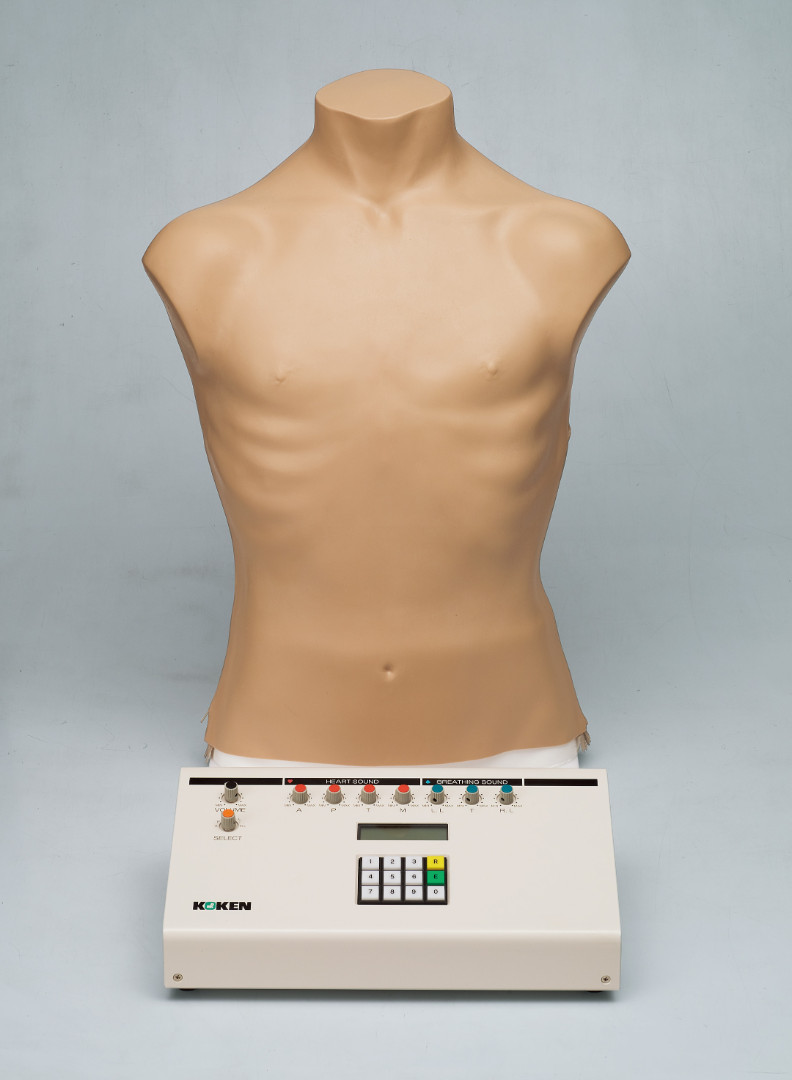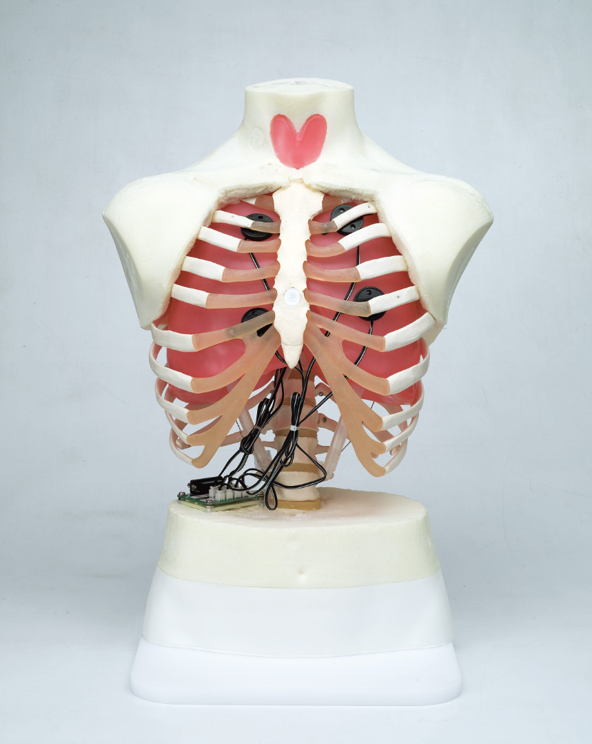 • модель грудной клетки имеет скелет грудной клетки, имитацию легких, встроенные в 4 местах динамики аускультации сердца, встроенные в 3 местах динамики аускультации дыхательных звуков