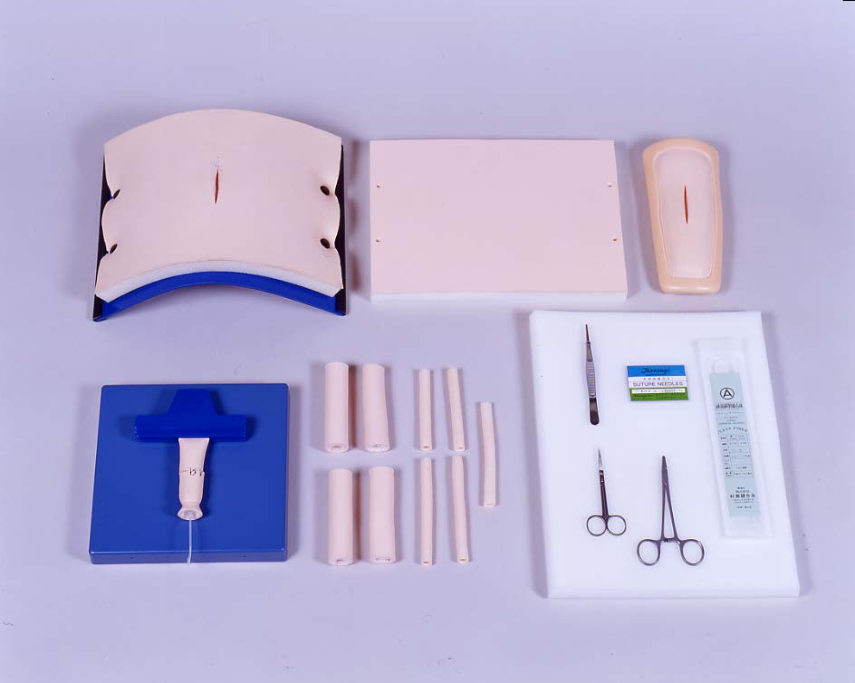 • набор включает модели кожи живота и конечностей в виде прямоугольных подушечек, а также трубчатые модели кровеносных сосудов и кишки
