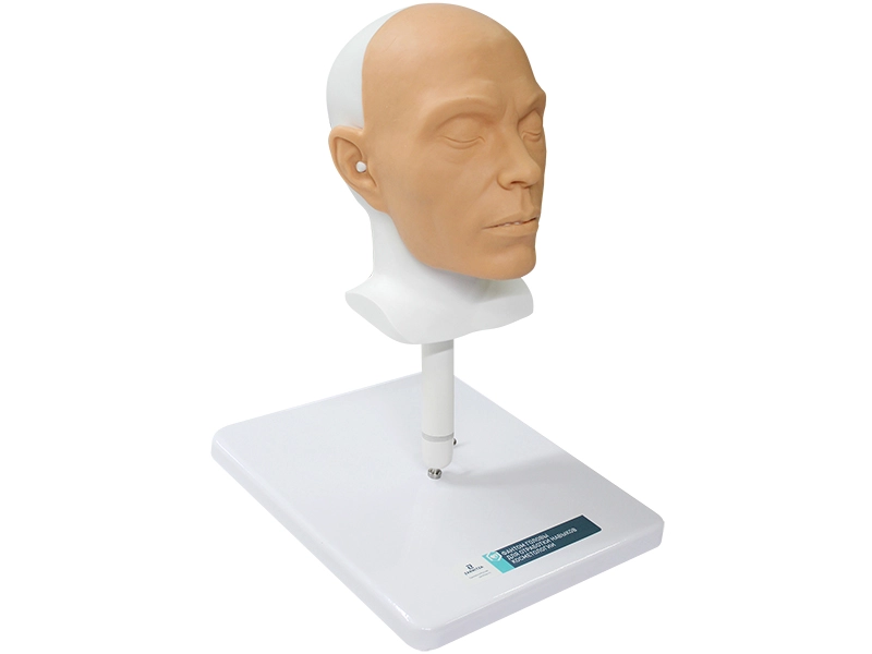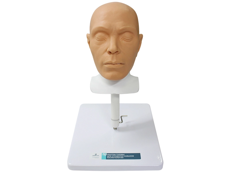 Модель головы реалистичных размеров с силиконовой кожей, анатомическими и возрастными особенностями. Имеет костные ориентиры на черепе, плотность кожного покрова в различных областях лица, толщина подкожно-жирового слоя, видимые возрастные изменения кожи для многократных инъекций.
