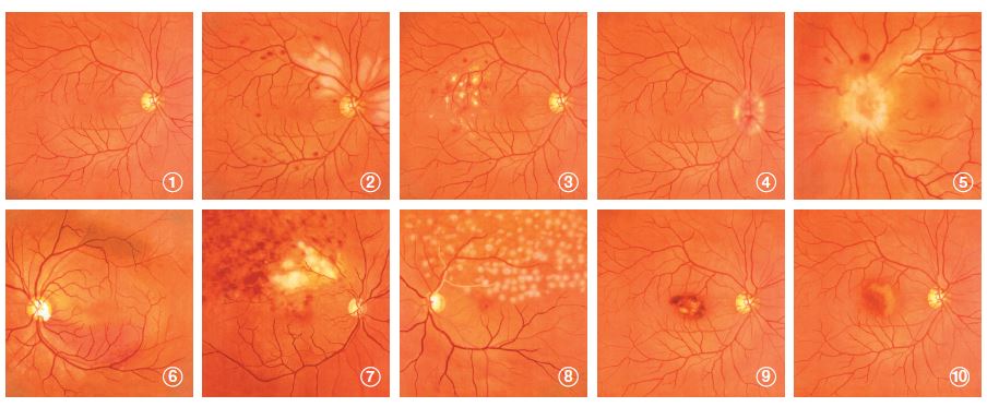 • комплект фото c изображением глазного дна в высоком разрешении, по 10 шт. для каждого глаза, в норме и с характерными изменениями при наиболее распространенных глазных болезнях: