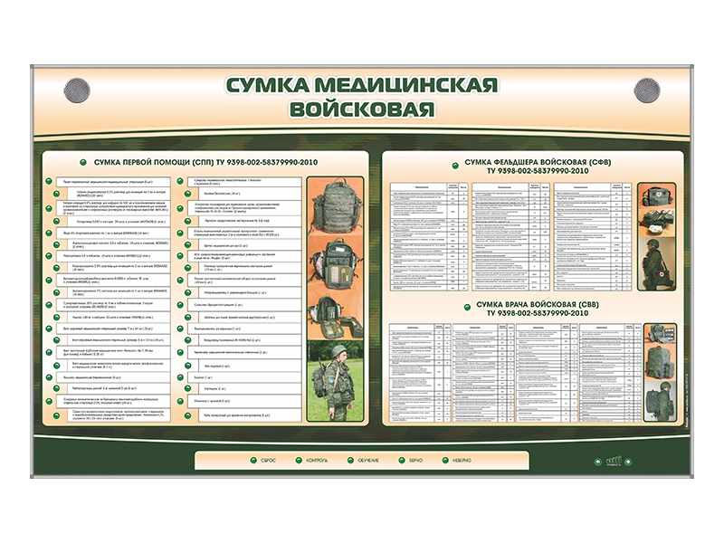 Интерактивный стенд представляет собой полноцветную информационную панель с комбинированной световой индикацией. На стенде представлена информация по составу сумки первой помощи, сумки фельдшера войсковой и сумки врача войсковой. В конструкцию учебного оборудования интегрированы высокочувствительные сенсоры для управления стендом при помощи интерактивного магнитного воздействия приемо-передающих устройств во время обучающего процесса и проведения тестовых заданий.