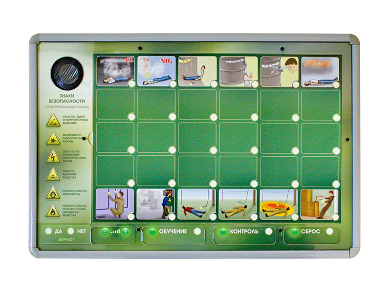 Мобильный модуль тестирования представляет собой электрифицированную светодинамическую панель с раздельной световой индикацией, на которую накладываются сменные фолии по следующим темам: