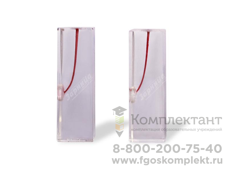 Комплект эндоблоков представляет собой набор из прозрачных прямоугольных блоков с искривленными на 20 и 30 градусов корневыми каналами, боковым выходом и стенками, окрашенными в красный цвет.