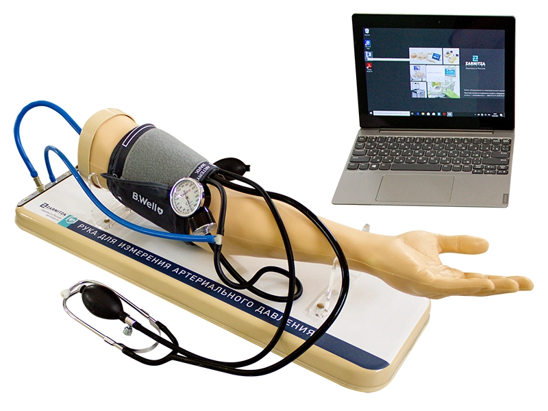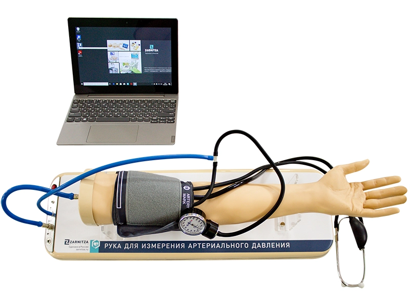 Тренажёр представляет собой модель руки на подставке и имитатор сфигмоманометра для измерения артериального давления.