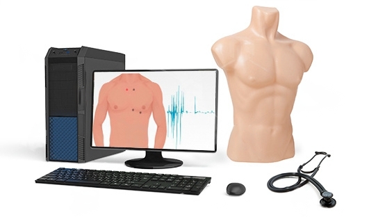 Данный учебный комплекс-манекен предназначен для отработки навыков аускультации и обучения распознаванию сердечных, дыхательных и кишечных шумов. Данный тренажерный комплекс позволяет отработать основные навыки аускультации с помощью специализированного имитатора стетоскопа со встроенными высококачественными динамиками и устройством воспроизведения. Полноразмерный манекен-имитатор торса взрослого человека содержит специализированные датчики-метки под кожей для обозначения типовых мест проведения аускультационного исследования.