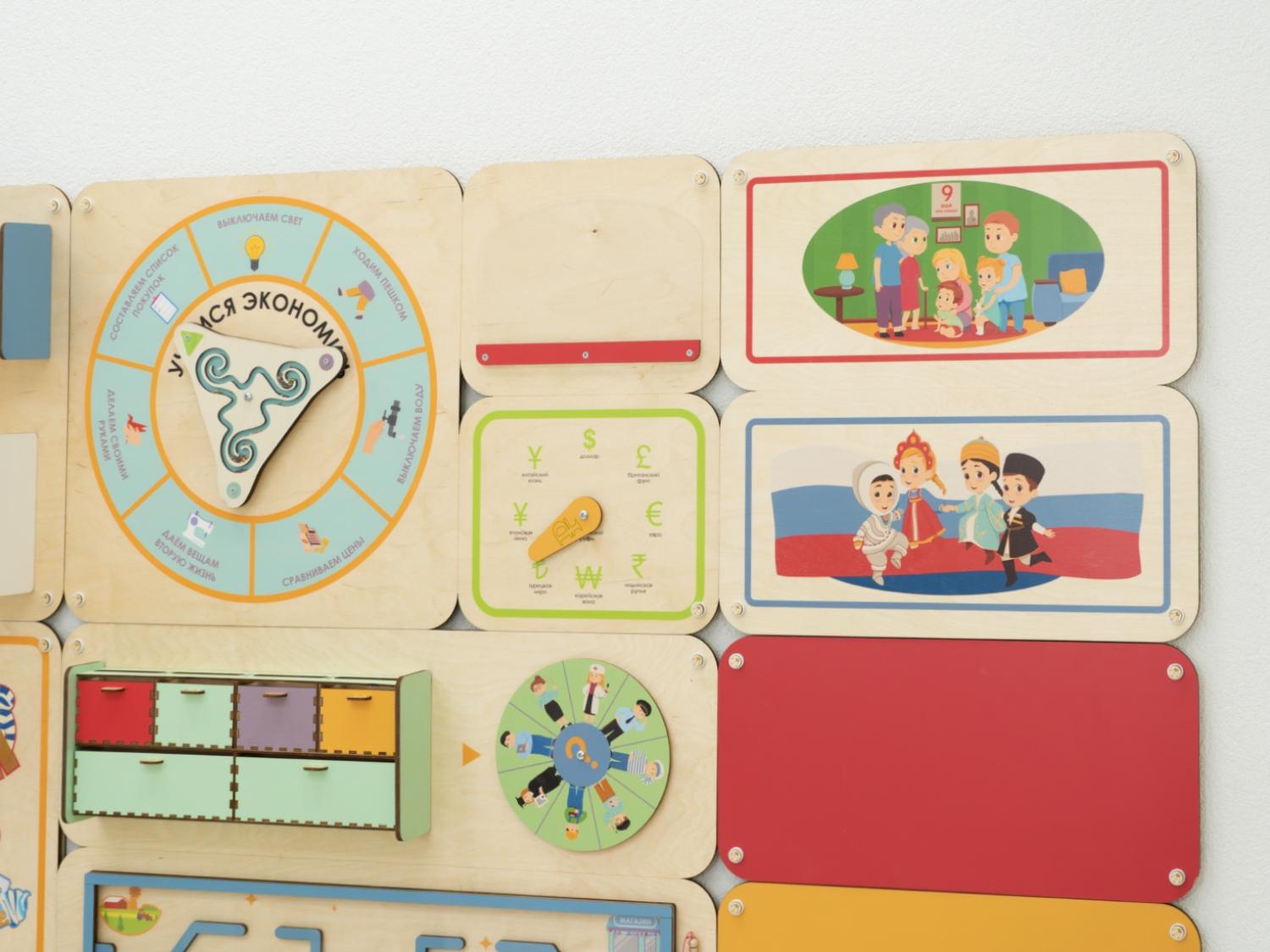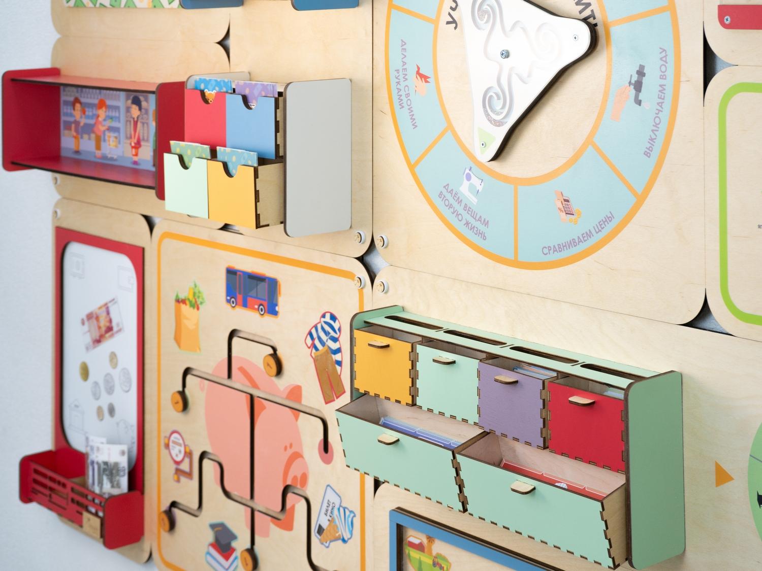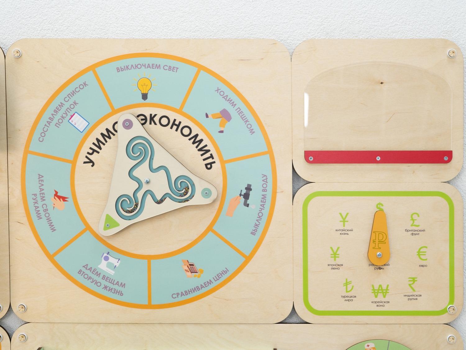 Панель увеличивает площадь полезного развивающего пространства в детском саду. Повесьте её на стену – и она не только станет незаменимым подспорьем в занятиях по финансовой грамотности, но и украсит помещение, скрывая дефекты стен.