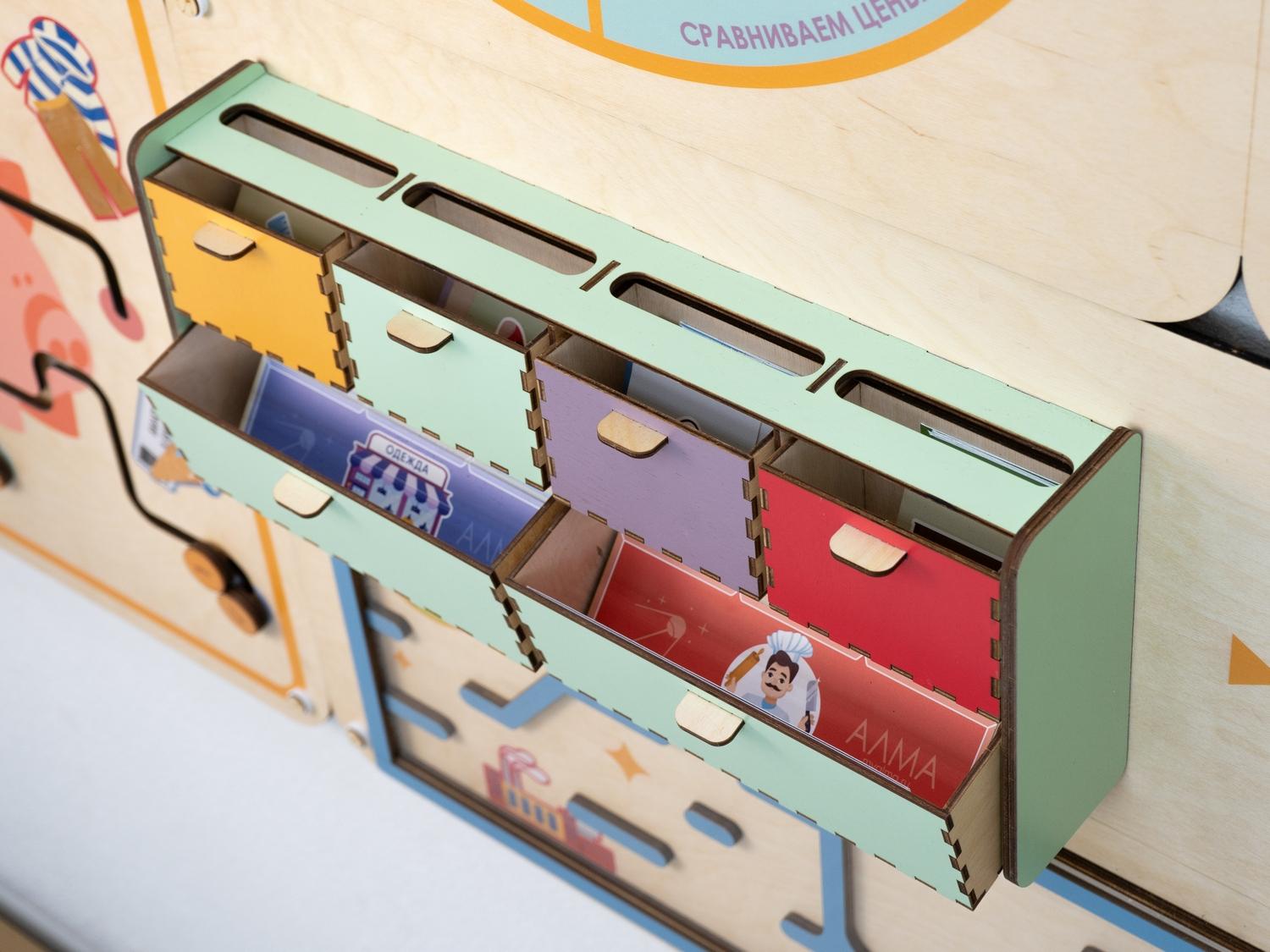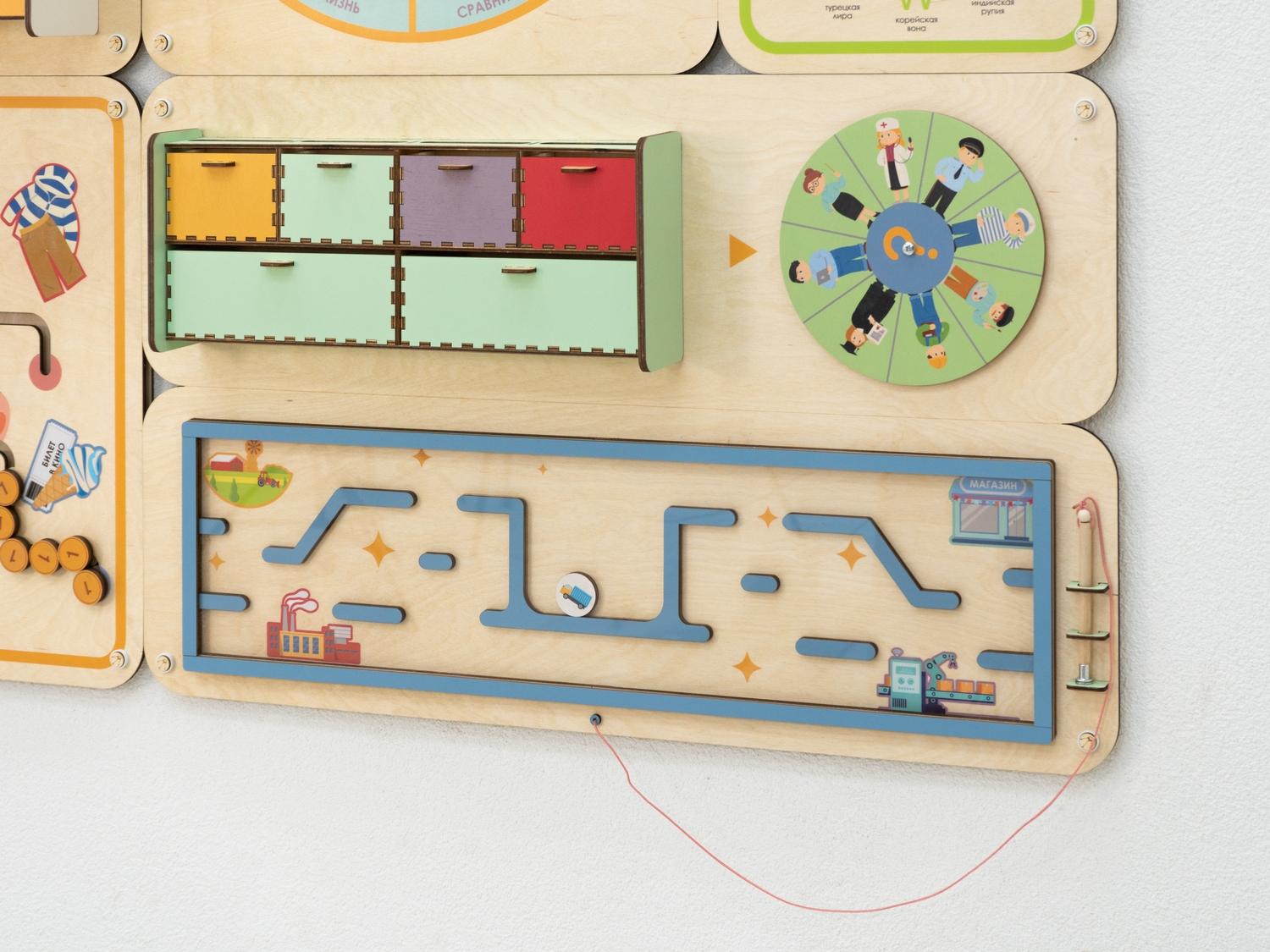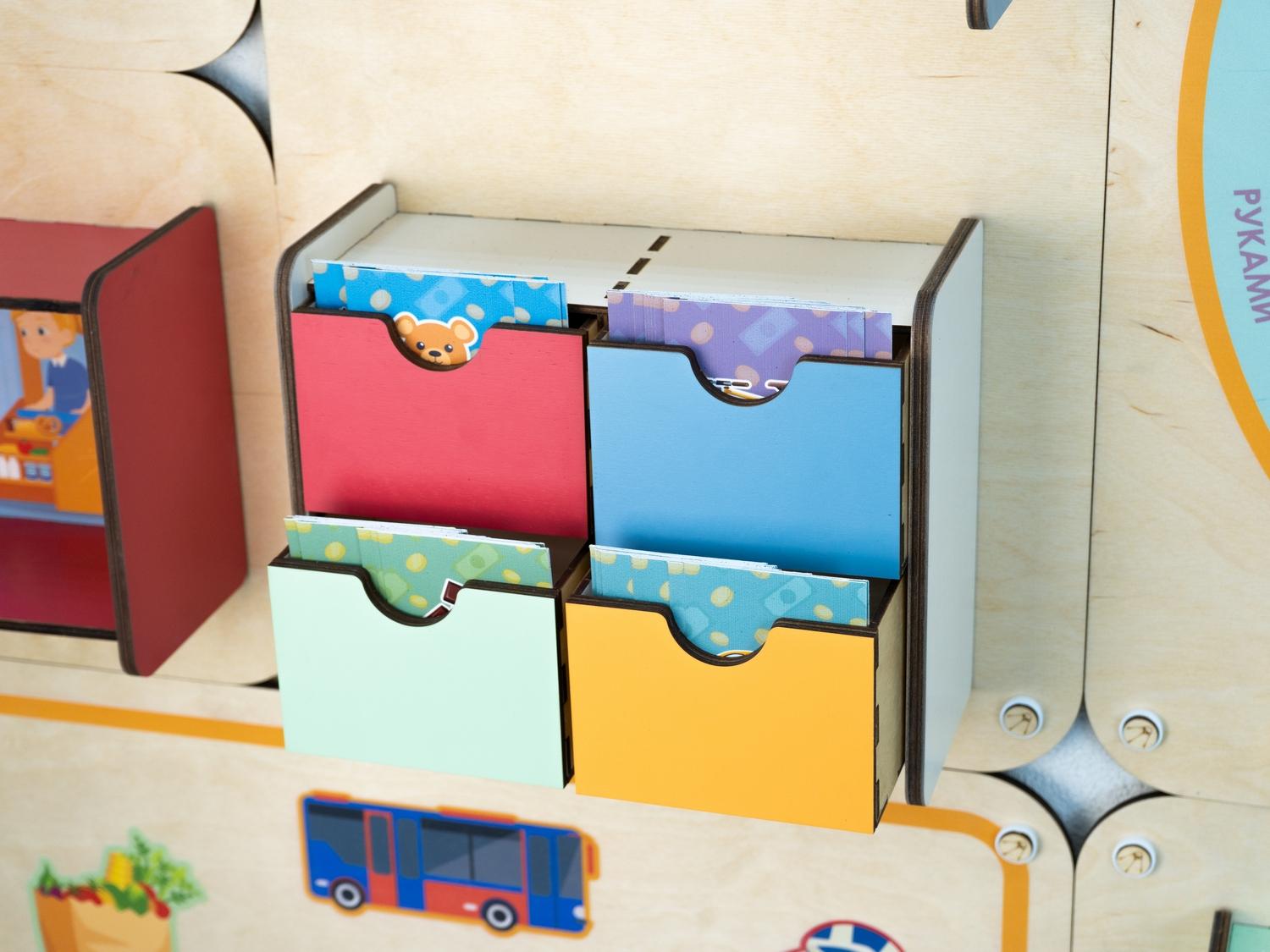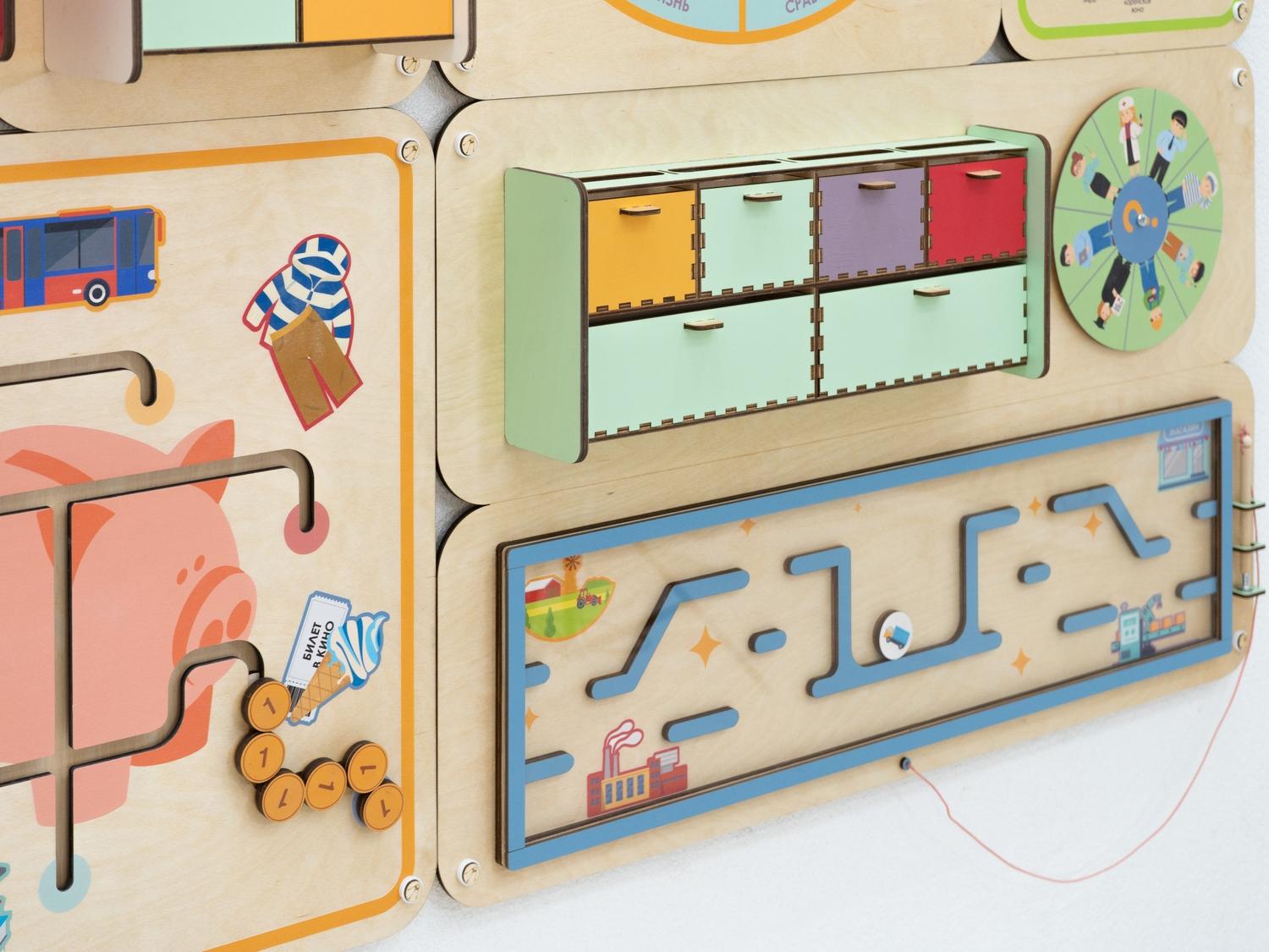 Панель увеличивает площадь полезного развивающего пространства в детском саду. Повесьте её на стену – и она не только станет незаменимым подспорьем в занятиях по финансовой грамотности, но и украсит помещение, скрывая дефекты стен.