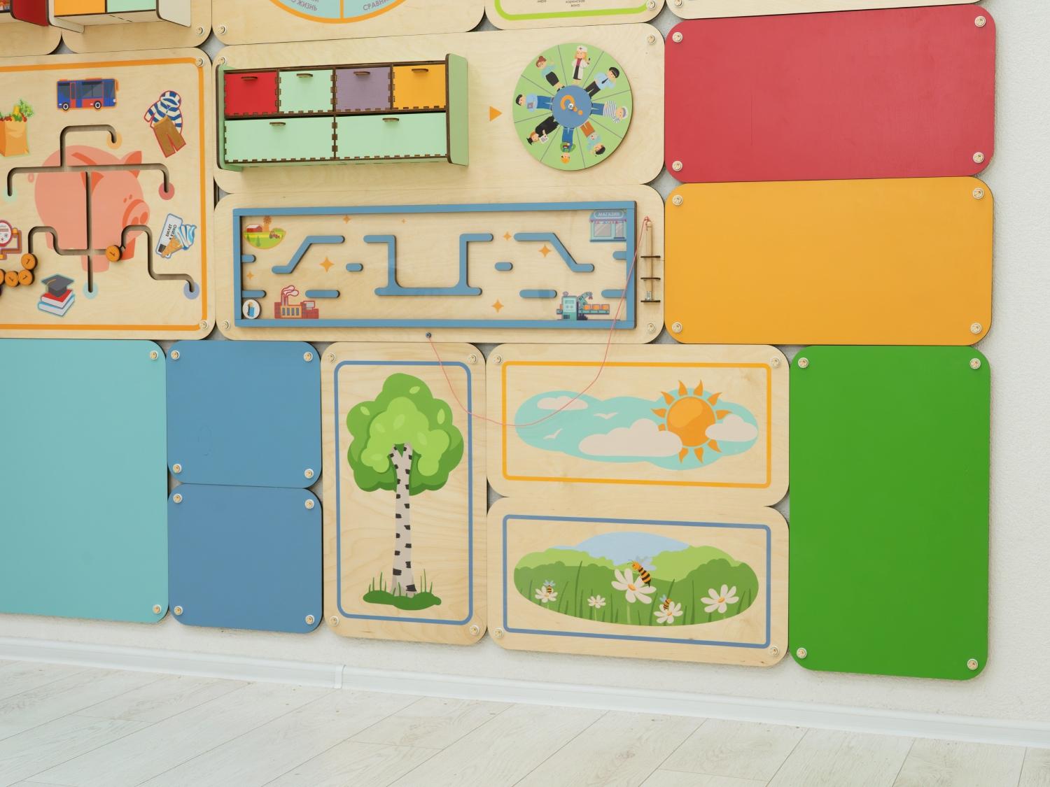 Дидактические панели отлично дополняют наборы цветных и иллюстрированных стеновых панелей, которые позволят оформить всё помещение в едином стиле.