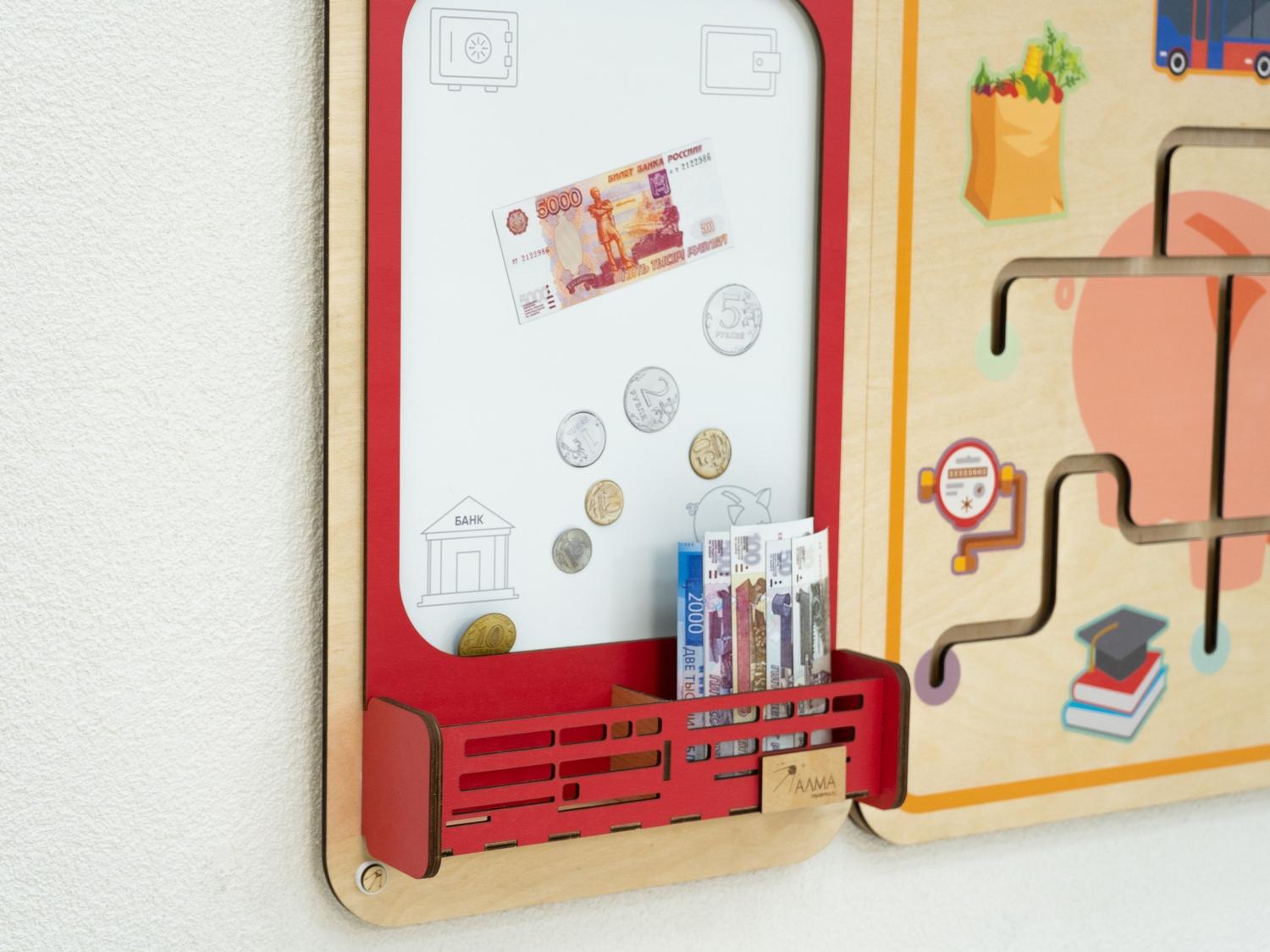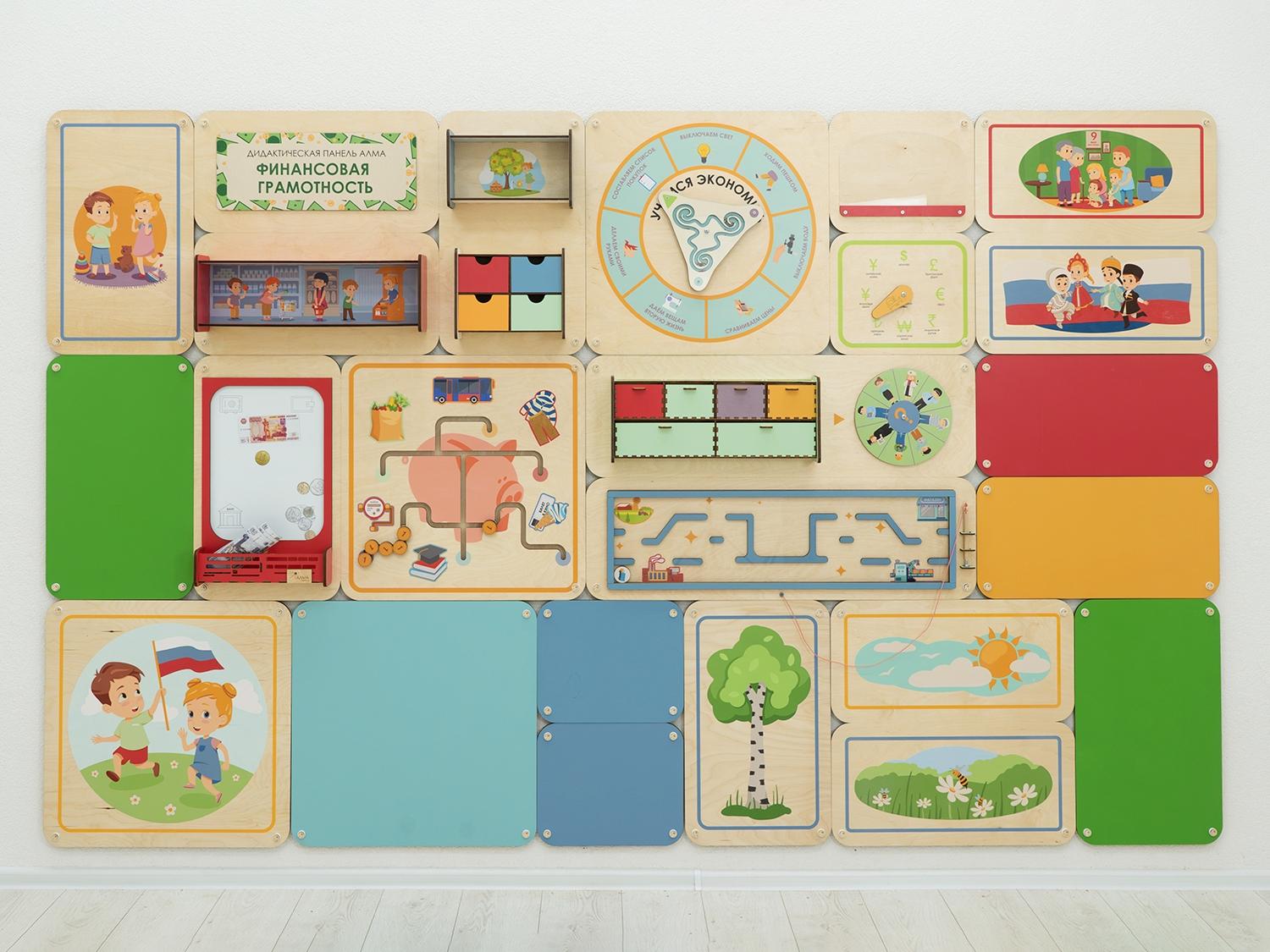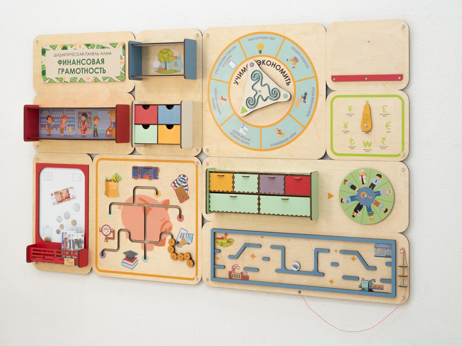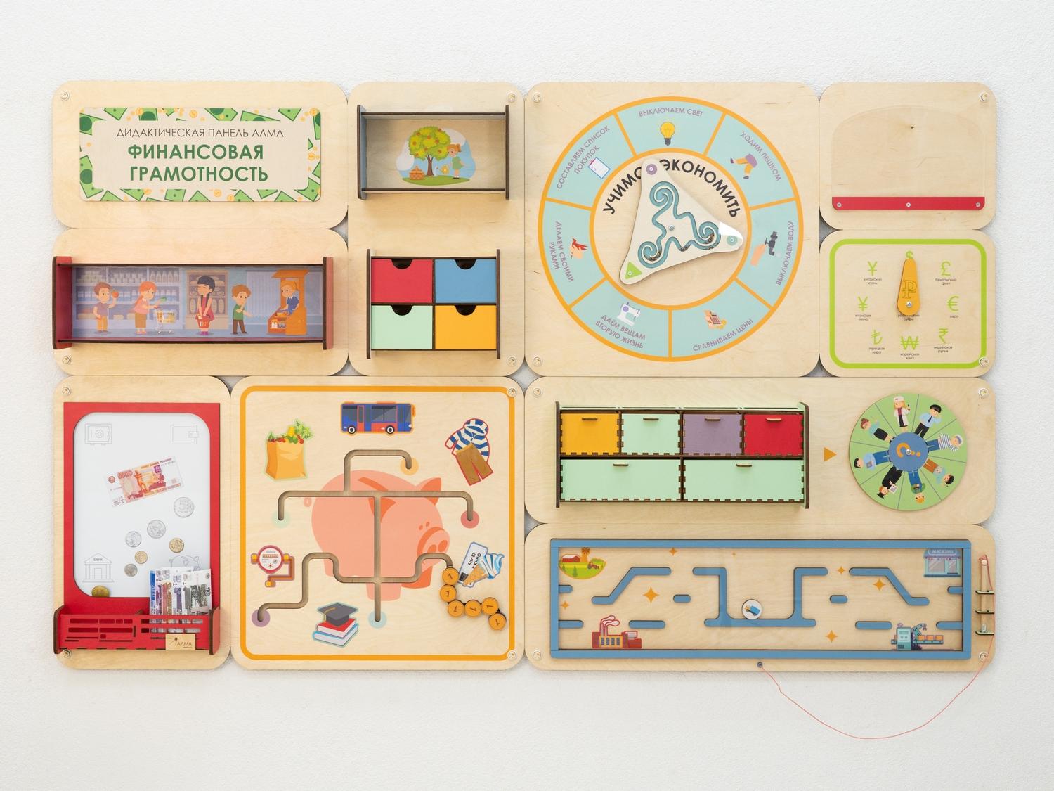Образовательно-развивающая настенная панель для обучения дошкольников в детских учебных учреждениях основам финансовой грамотности. Игровые элементы по системе Монтессори развивают мелкую моторику детей, а подробное методическое руководство помогает педагогам в проведении занятий. Подходит для оснащения детских садов и учреждений дополнительного детского образования.