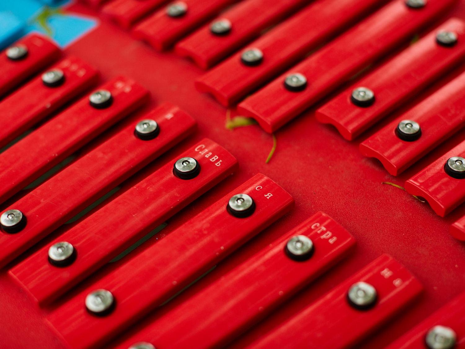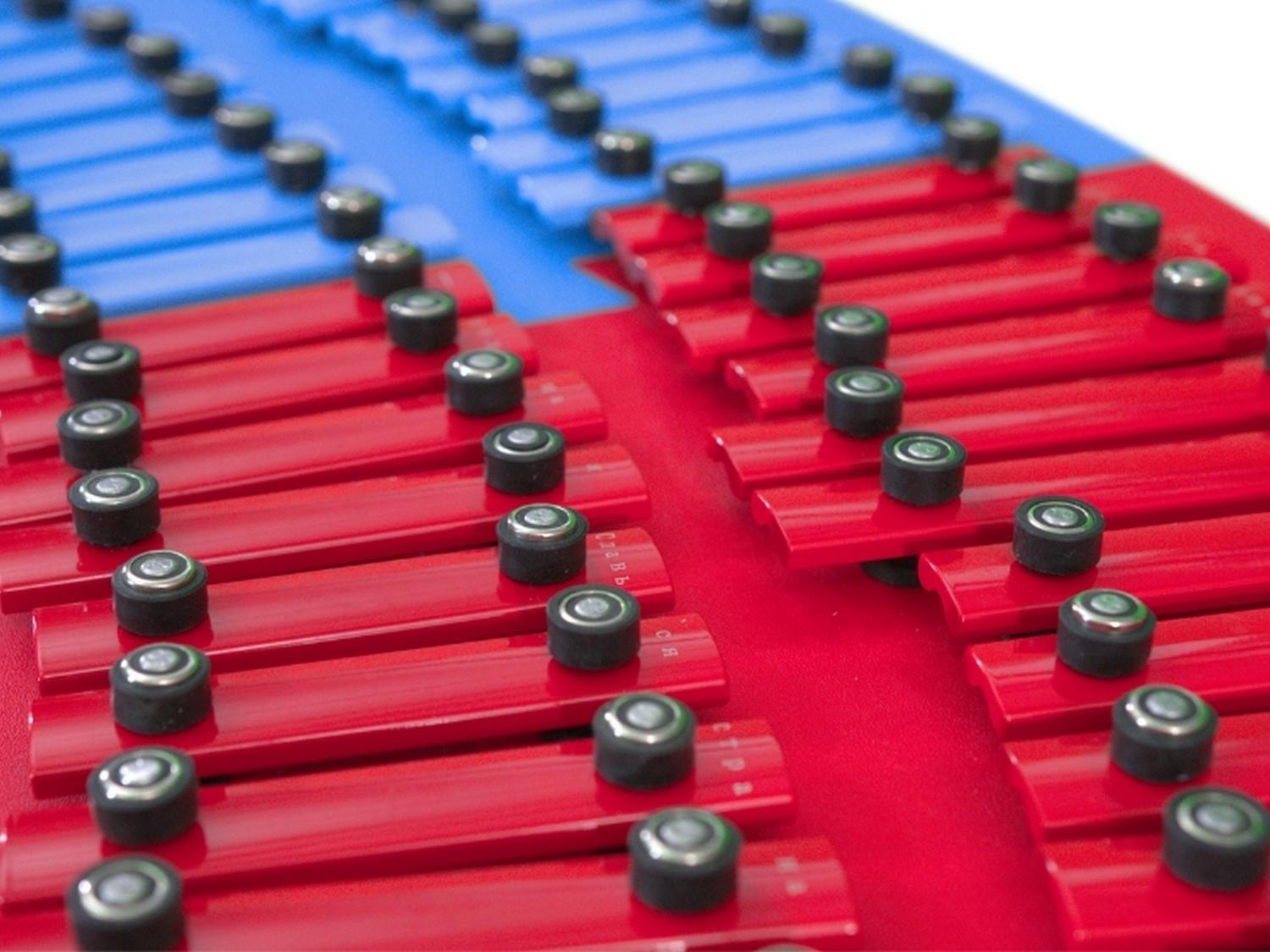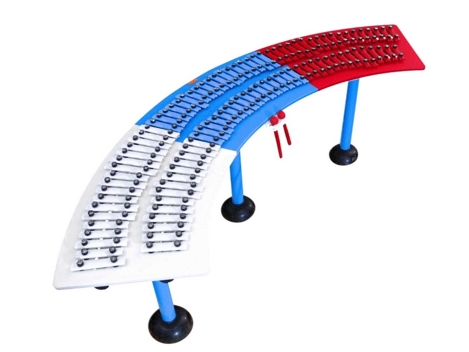 Металлофон в цветах российского триколора, нотные пластины музыкального инструмента расположены так, что любой пользователь может сыграть гимн России без предварительной музыкальной подготовки и пропеть его, пользуясь текстом, нанесенным на клавиши.