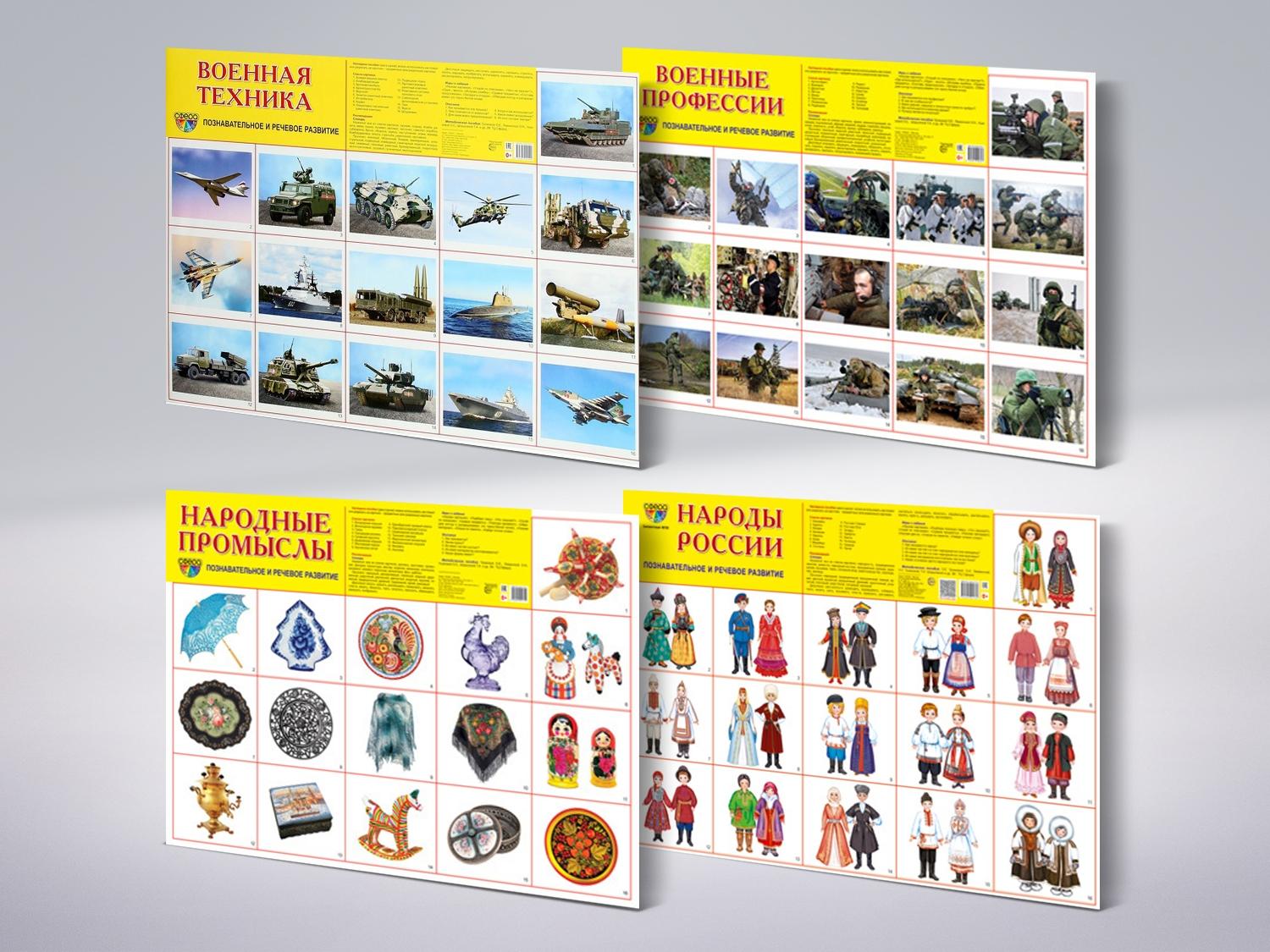 Комплект демонстрационных плакатов – отличное пособие, которое поможет ребенку развивать свой кругозор, тренировать память, улучшать логическое и образное мышление. С ним в игровой форме дети познакомятся с армейской техникой и военными профессиями защитников нашей Родины, изучат народы нашей страны и смогут узнать, какие бывают народные промыслы.