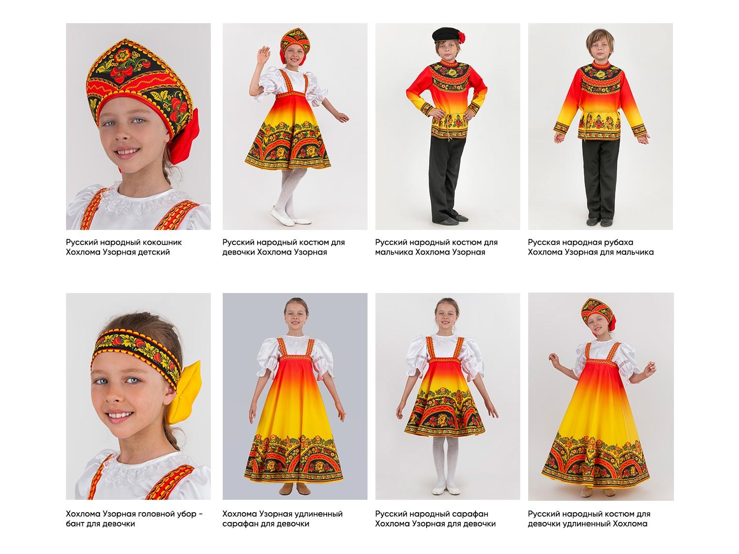 Красивые костюмы с традиционной росписью Хохлома станут украшением тематического праздника, театрального представления или новогоднего утренника, подойдут для эффектного образа детей разного возраста. В них сочетается яркость и приглушенные тона, что делает образ оригинальным и привлекательным.