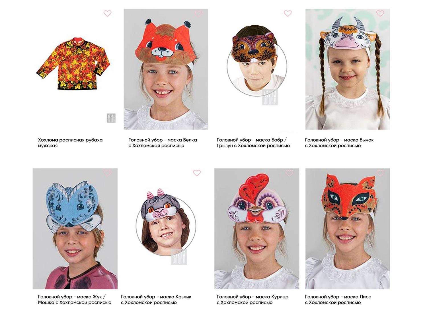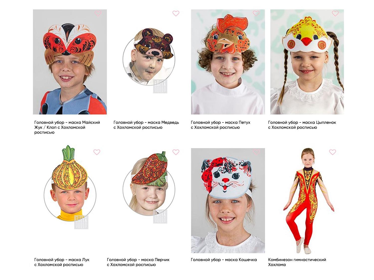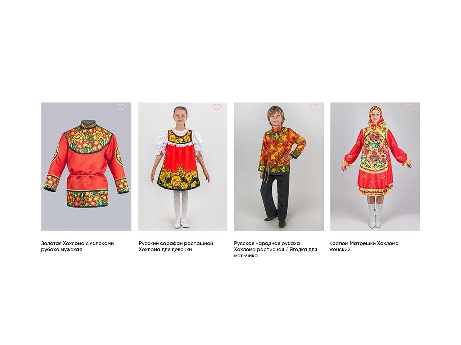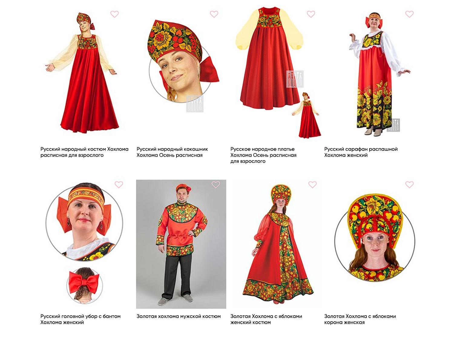 Костюмы и аксессуары в стиле Хохлома – модели, стилизованные под традиционную русскую роспись, которые станут настоящим украшением и добавят народного колорита любому празднику. В их дизайне преобладает черный, красный оттенок и золотистые вкрапления, зеленые и коричневые штрихи. Для производства одежды и аксессуаров использованы технологии ручной росписи и современная печать на ткани. Мастера создают рисунок по лекалам каждой модели. Затем принт оцифровывается и наносится на тканевую поверхность, а потому изображения детализированы, уникальны и не похожи на другие.