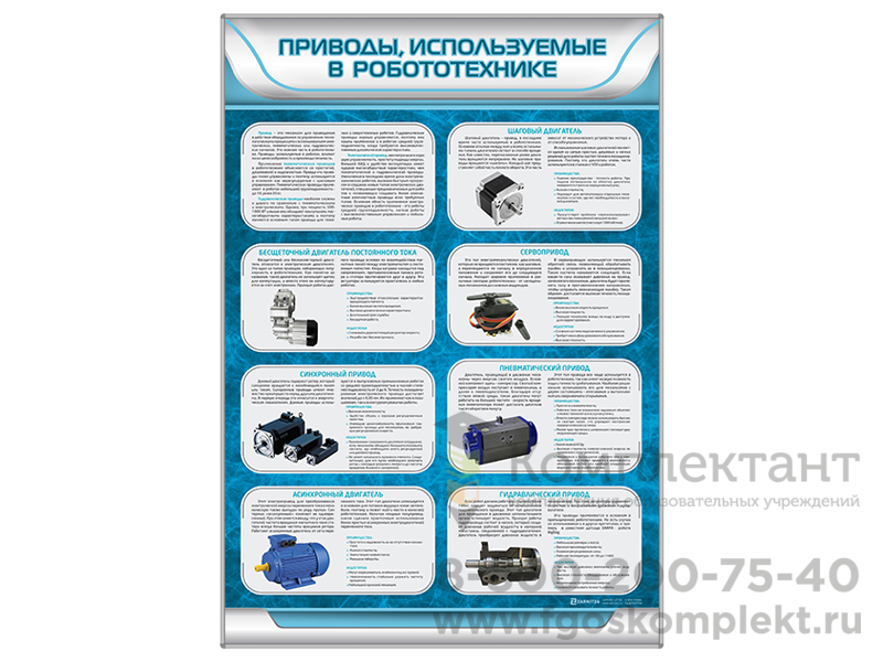 Стенд "Привода, использующиеся в робототехнике", предназначен для образовательных учреждений. Он наглядно демонстрирует различные типы приводов и их применение, способствуя глубокому пониманию принципов работы роботов. Идеально подходит для занятий по робототехнике, стимулируя интерес к инженерному делу у школьников и студентов.