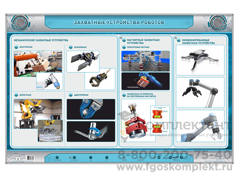 Электрифицированный стенд представляет собой панель с раздельной световой индикацией. На стенде представлена информация о захватных устройствах, использующихся в робототехнике, - механических, магнитных, вакуумных и т.д. Электрифицированный стенд предназначен для изучения захватных устройств, применяемых в робототехнике, и проведения интерактивного тестирования по данной теме на уроках.