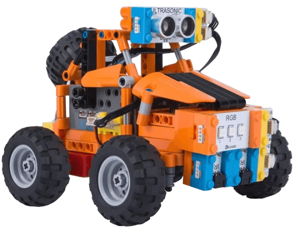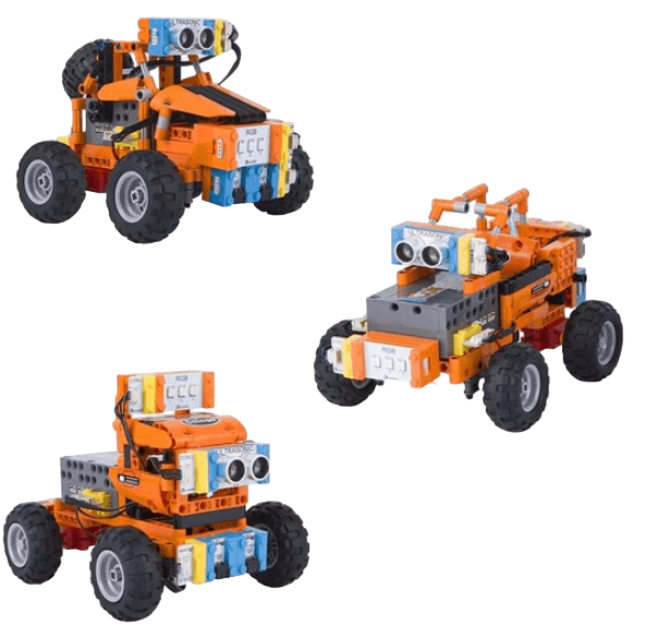 Из готового комплекта деталей вы можете создать несколько вариантов автомобилей. Производитель предлагает 3 предварительно разработанные конструкции для сборки роботов. В комплекте есть детали для сборки корпуса, блок управления, датчики, приводы и двигатели.