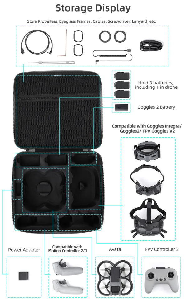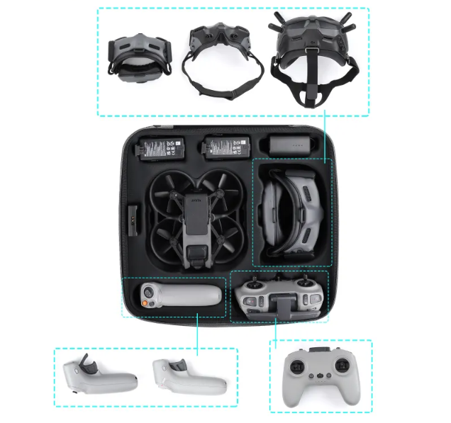 Кейс большой емкости: в него помещается дрон Avata, FPV Controller 2, очки Goggles Integra / Goggles 2 / FPV Goggles 2, Motion Controller 2 или 1, батарея Goggles 2 - 1 шт, 3 батареи для дрона (включая 1 в дроне), адаптер питания и некоторые аксессуары, такие как оправы для очков, кабели, отвертка, ремешок и т.д..