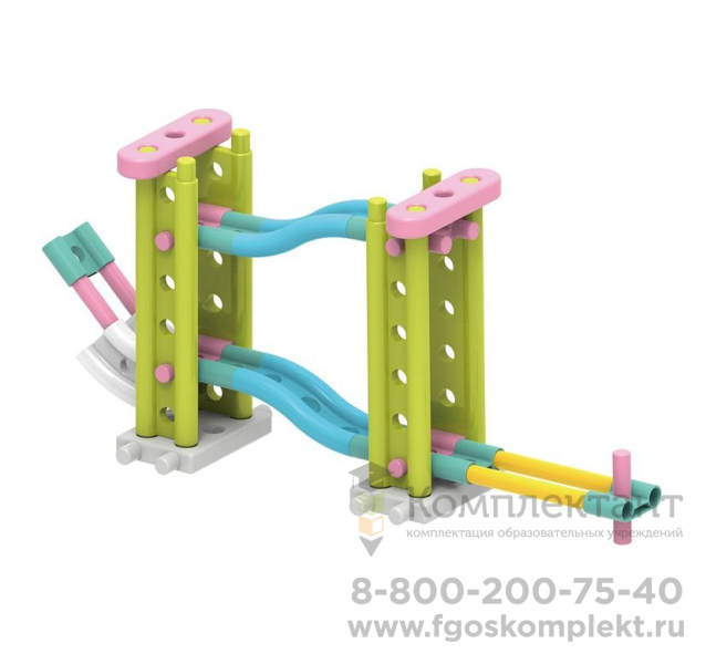 Предназначен для детей от 3 лет. Детали в нем крупные и легкие, красочные и очень разнообразные. Здесь есть винты, гвозди и гайки, соединительные панели и балки, кубик с 6 отверстиями и призмы, оси, штифты и даже две шестеренки. Но самые интересные элементы – это различные шарики и детали для сборки горок, по которым эти шарики можно запускать!