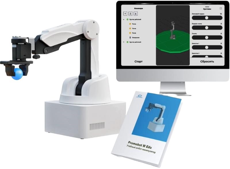 Образовательный коллаборативный манипулятор Promobot M Edu — это учебный робот-манипулятор, созданный для изучения робототехники и программирования в школах и других образовательных учреждениях. Этот многофункциональный настольный четырёхосевой робот поставляется с набором сменных инструментов и дополнительных устройств, а также программным обеспечением для управления и программирования.