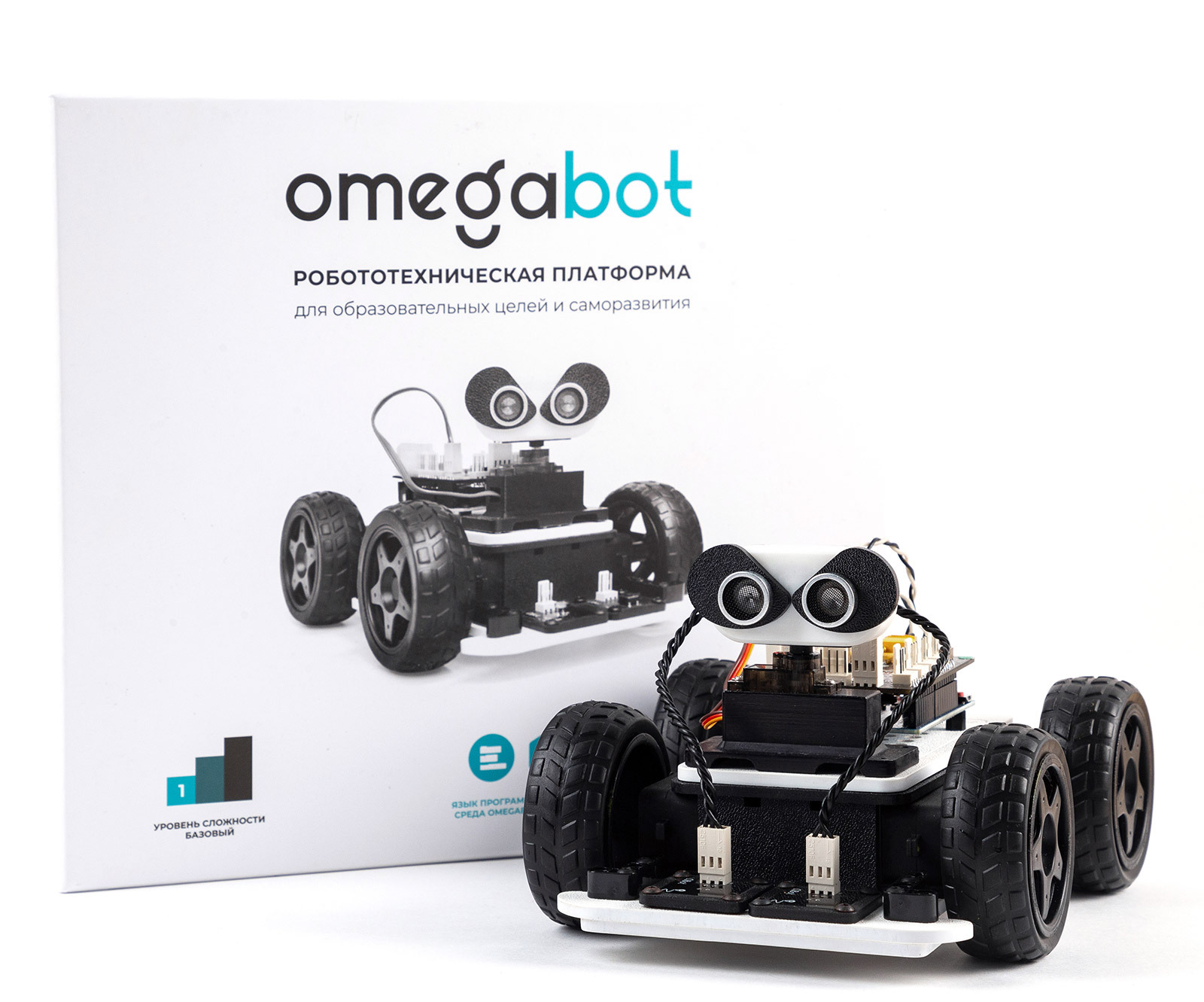 OmegaBot разработан специально для обучения робототехнике и программированию в визуальной среде, С++ и Python в образовательных учреждениях. Основу конструктора составляют универсальный программируемый контроллер OmegaBot и колесная платформа со встроенным аккумуляторным блоком, имеющая магнитные крепления для навесных модулей. Программируемый контроллер разработан на архитектуре Arduino.